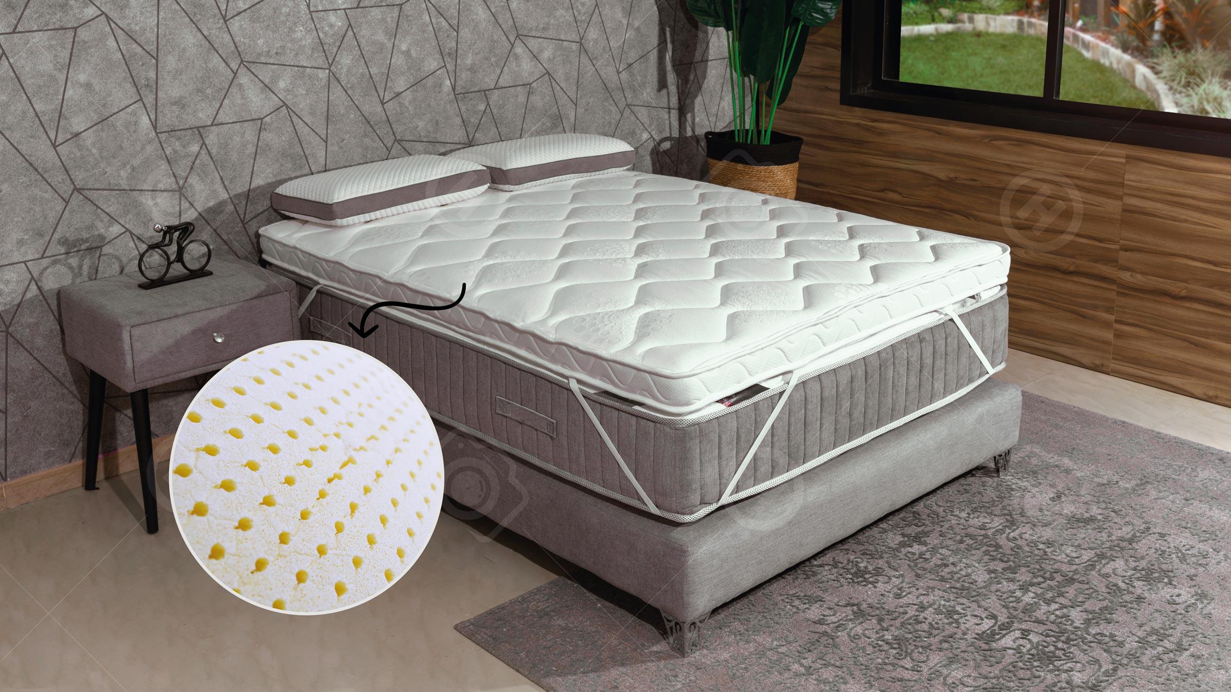 لحلول ذكية ومريحة في عالم النوم، تم ابتكار طبقة دعم ب سماكة 9سم مصنوعة من مكون داخلي (اسفنج الفيسكو الذكي أو اسفنج اللاتكس الطبيعي أو اسفنج السيجول – اسفنج عالي الكثافة). هذه الطبقة تقدم أفضل وضعية لعمودك الفقري مع بنيتها الطبية وتضمن توزيع مثالي للضغط من أجل تحقيق الاسترخاء التام. الجودة العالية في القماش المحبوك يوفر بيئة نوم رائعة، قابل للإزالة مع سحاب. مزود ب أربعة أحزمة مطاطية متينة في الزوايا ويمكن استخدامها على الجالين.